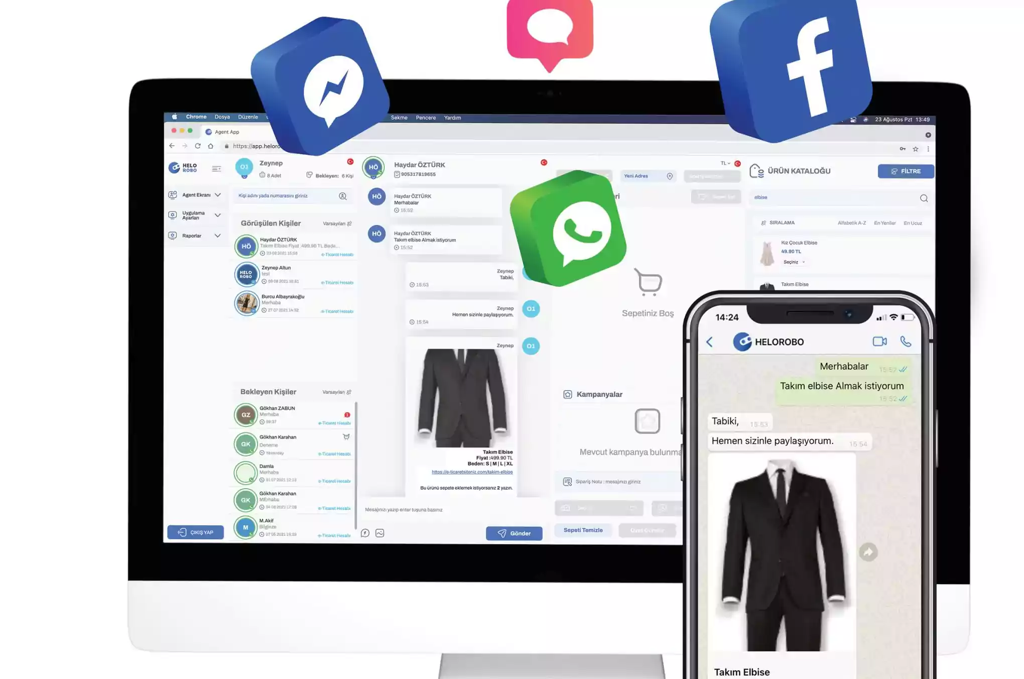 HeloRobo, WhatsApp ve Facebook Messenger üzerinden müşterilerinizle sohbet etmenizi, ürünlerinizi tanıtmanızı ve bu ürünleri hızlı bir şekilde satışa dönüştürmenize olanak sağlıyor.